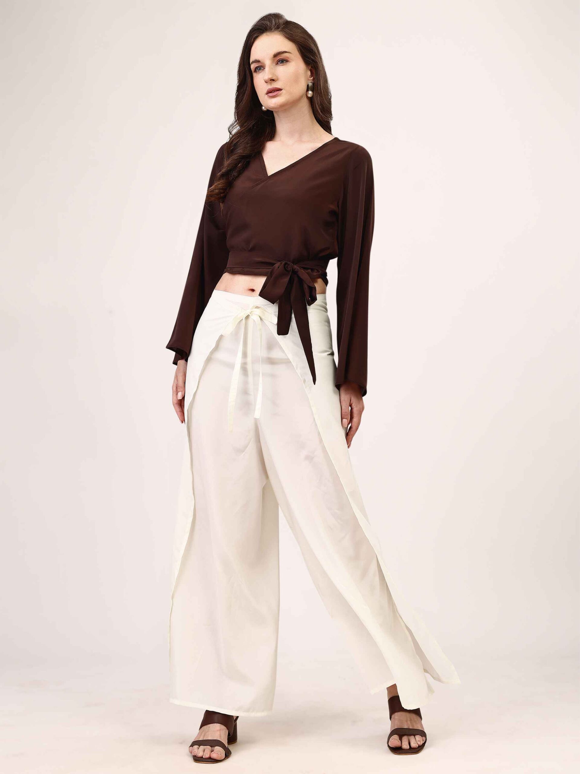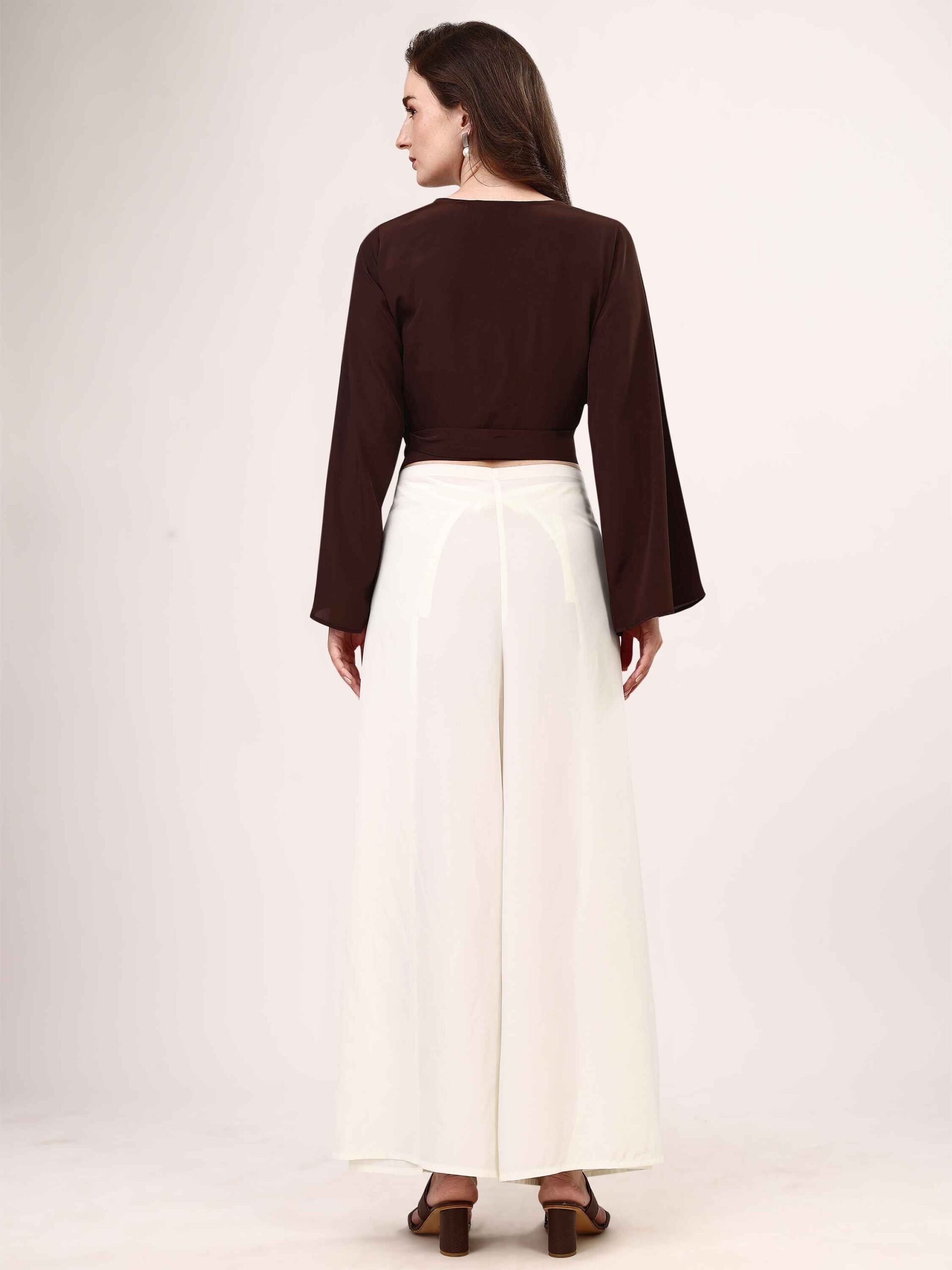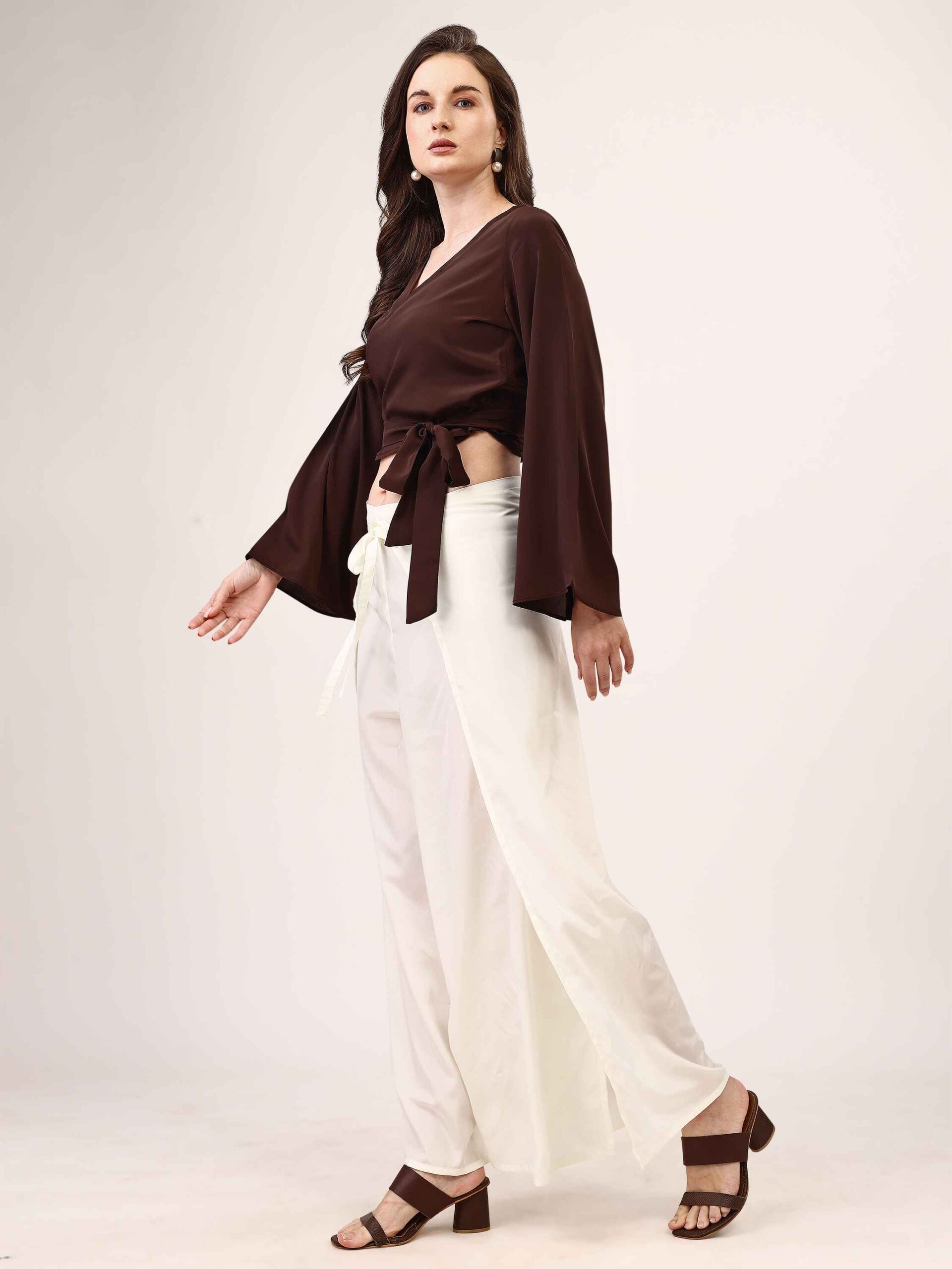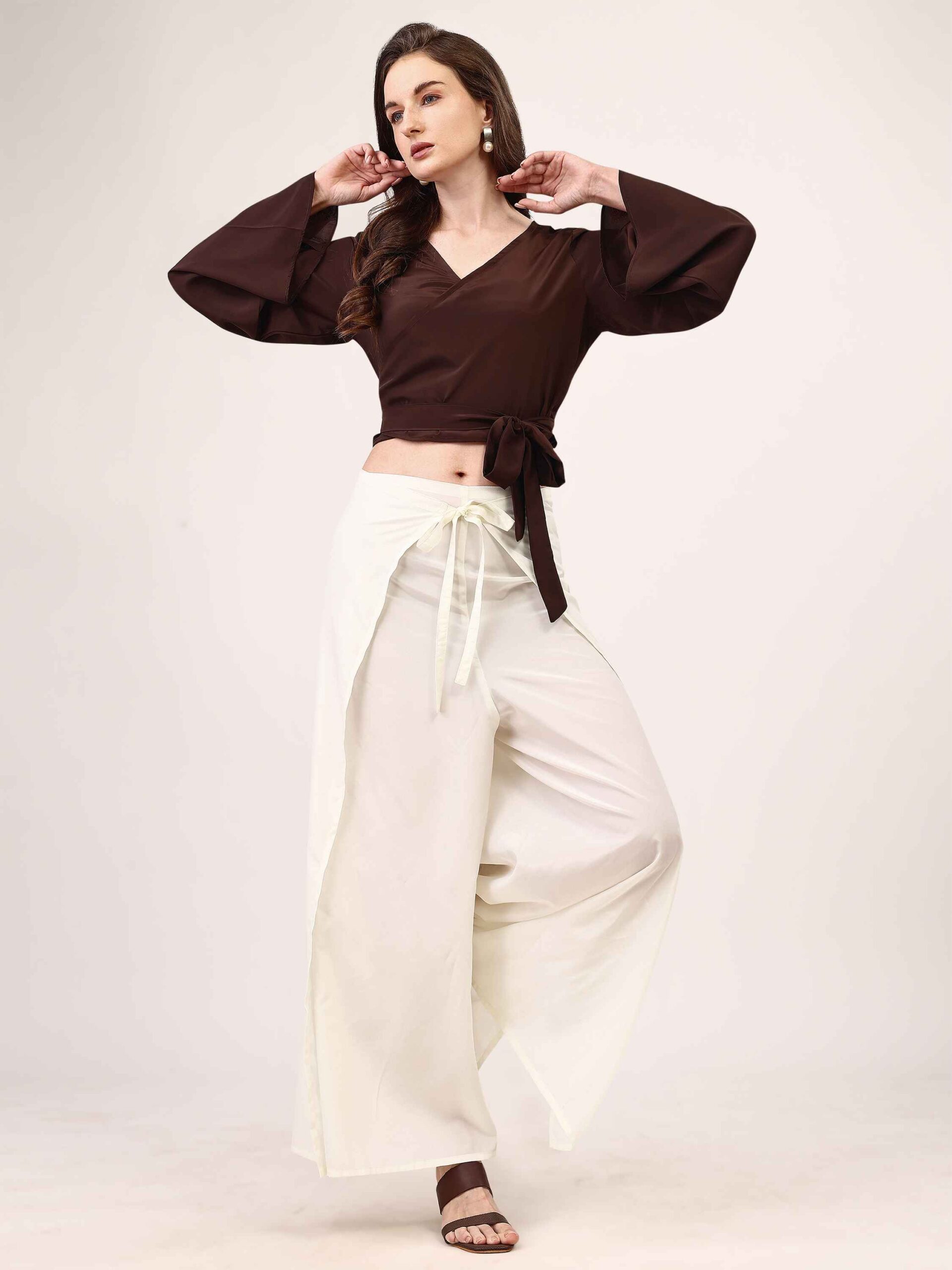 Turn heads with the ” Off-white Wrap Around Palazzo & Mocha Top,” a stunning blend of style and sophistication. Designed with a flattering wrap silhouette, this palazzo offers effortless elegance that enhances your figure. Expertly crafted from premium crepe, it boasts a gentle sheen, a soft touch, and unparalleled comfort. Step into its captivating allure and leave an unforgettable impression.