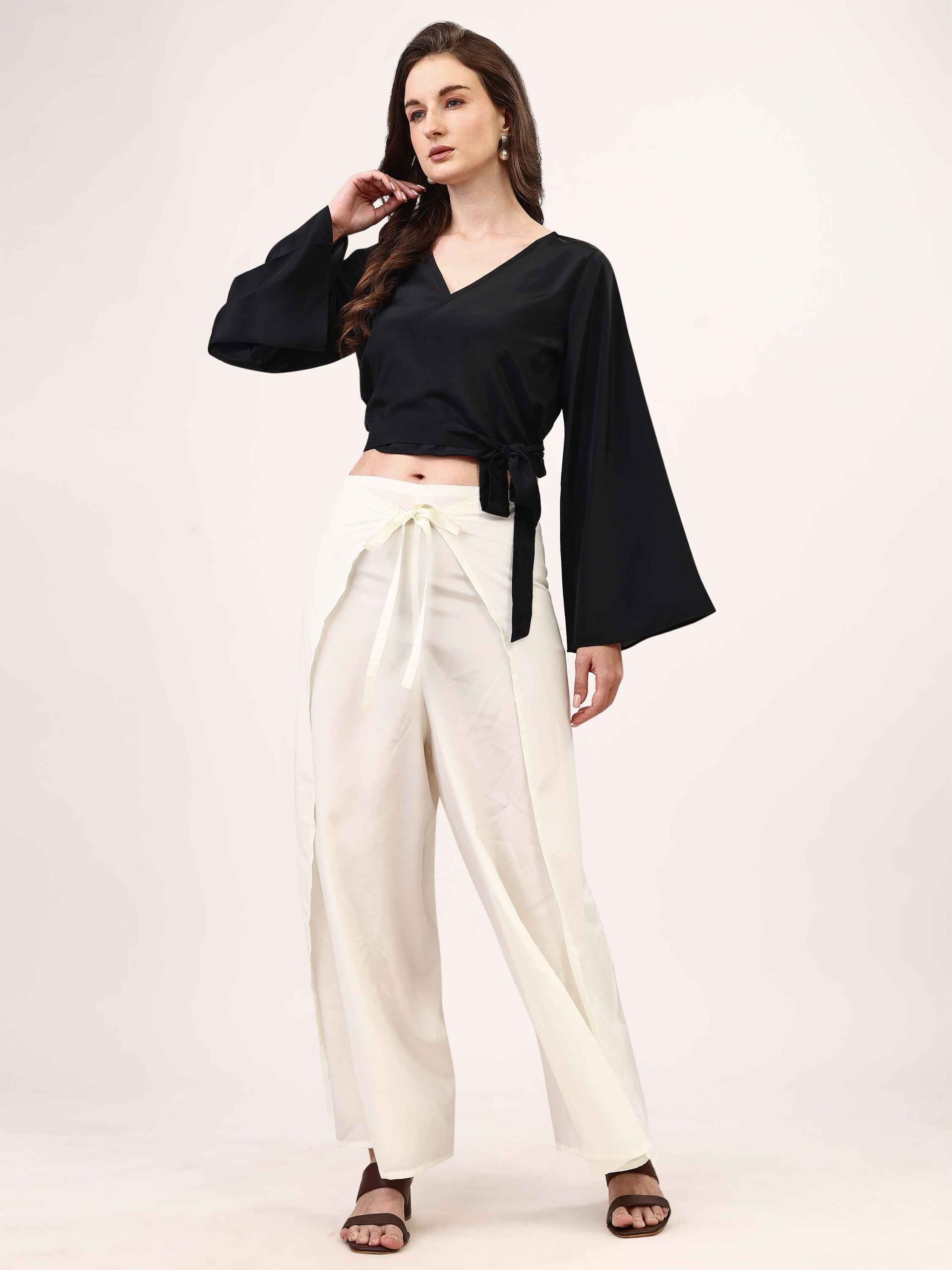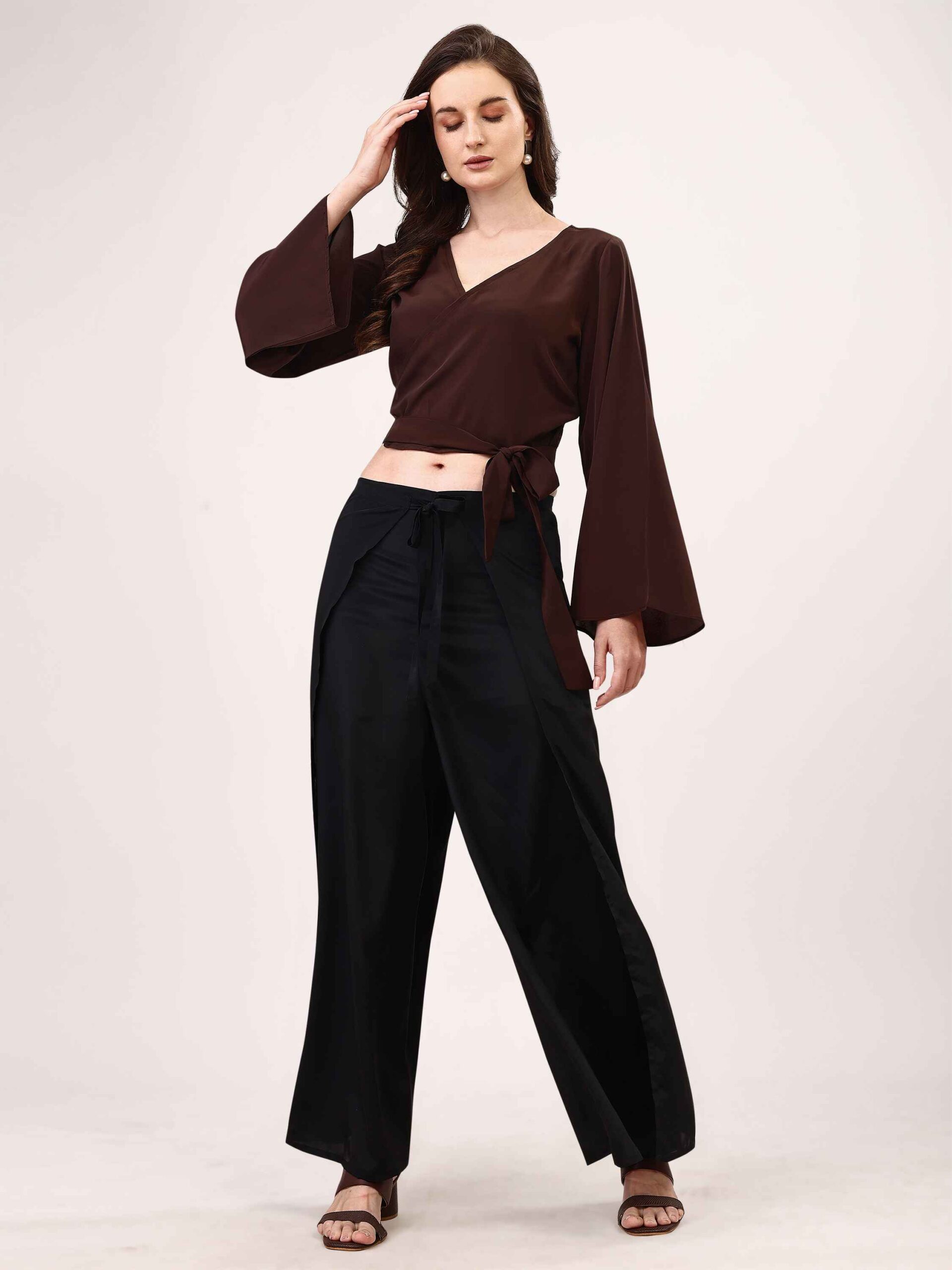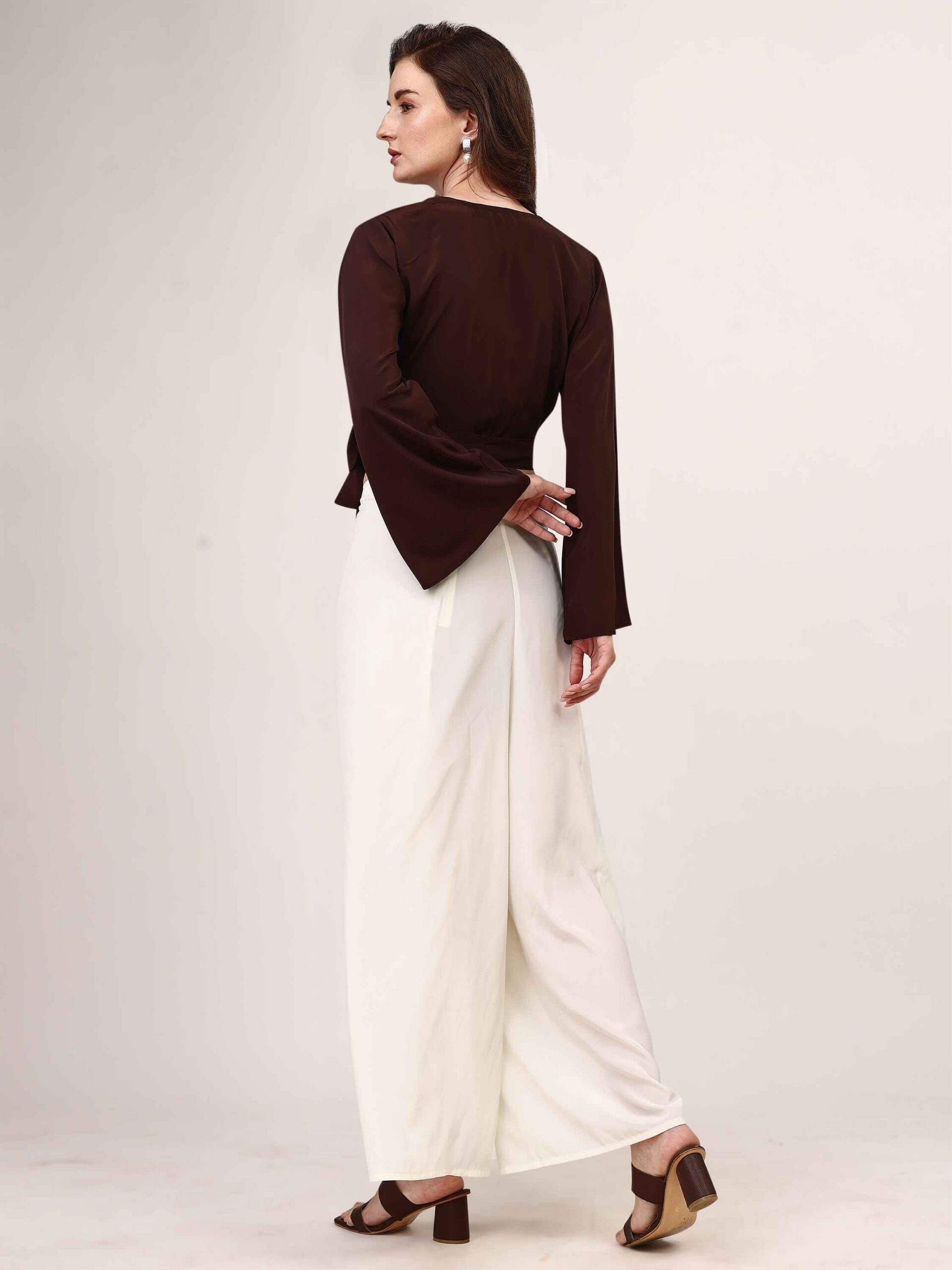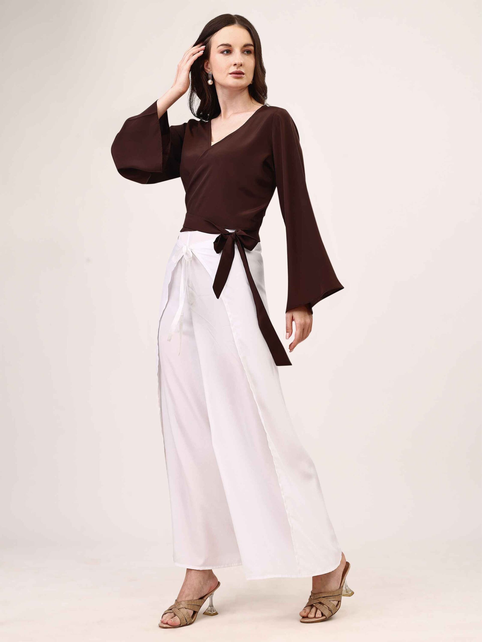 Turn heads with the ” Off-white Wrap Around Palazzo & Mocha Top,” a stunning blend of style and sophistication. Designed with a flattering wrap silhouette, this palazzo offers effortless elegance that enhances your figure. Expertly crafted from premium crepe, it boasts a gentle sheen, a soft touch, and unparalleled comfort. Step into its captivating allure and leave an unforgettable impression.
