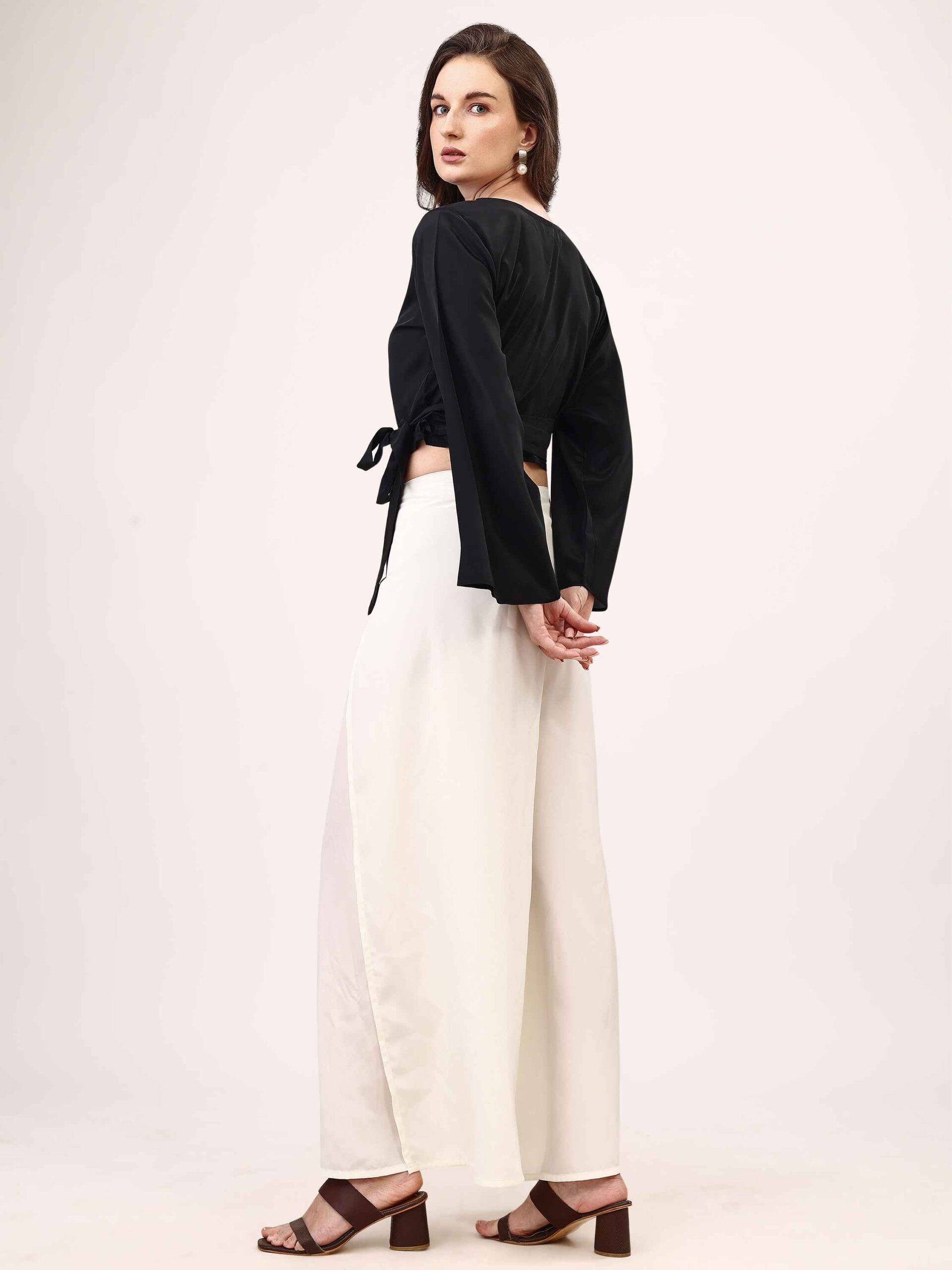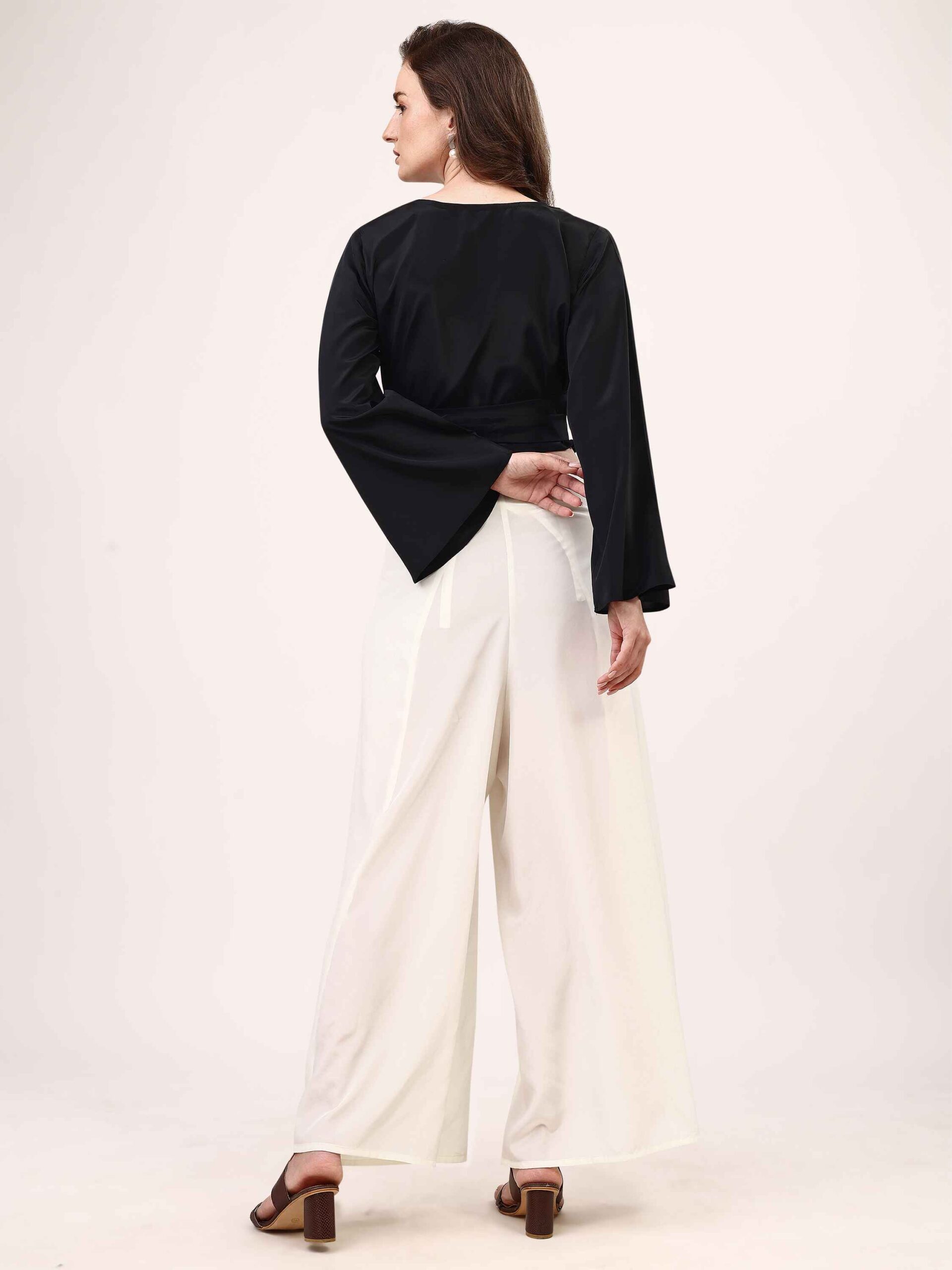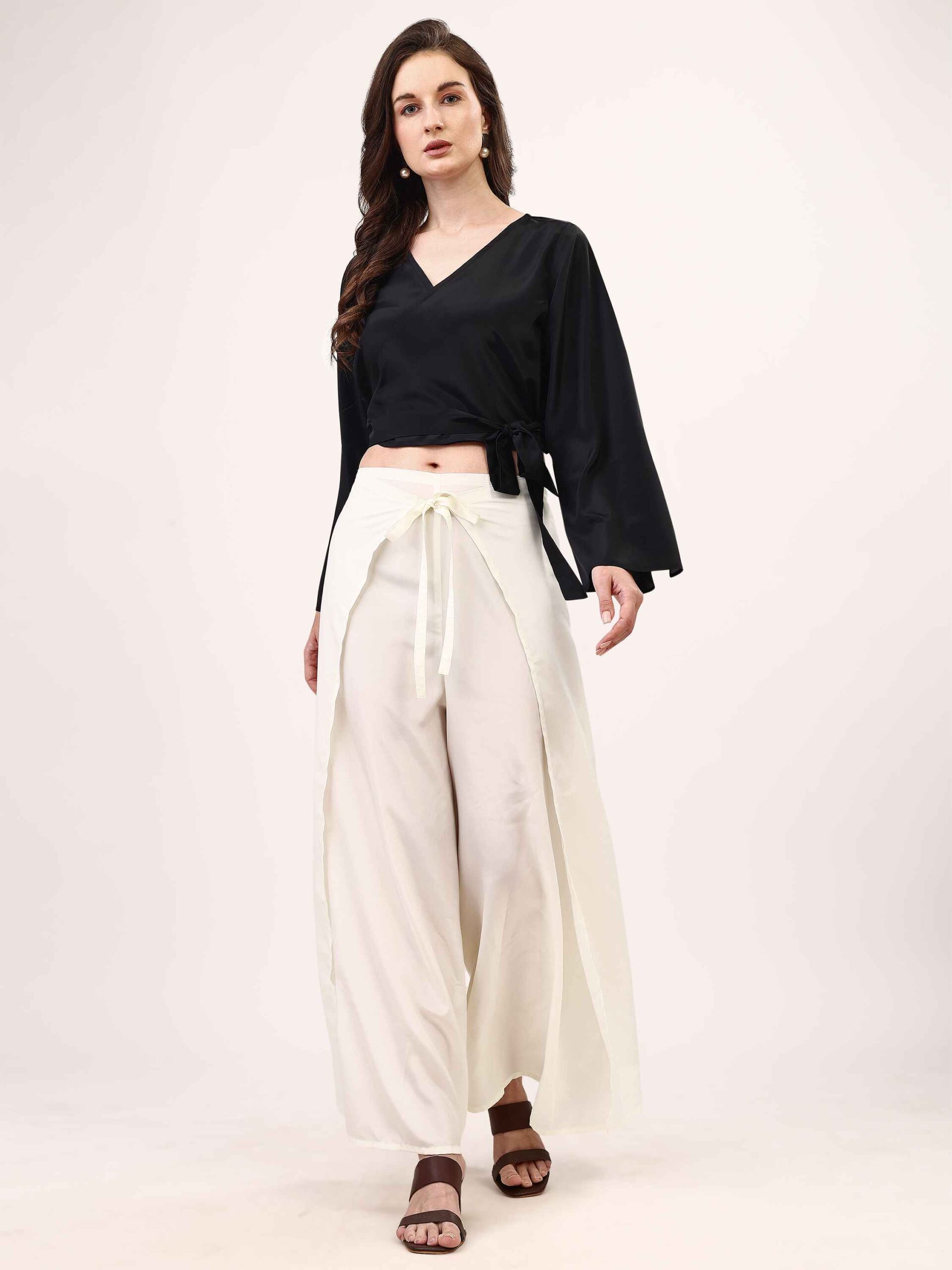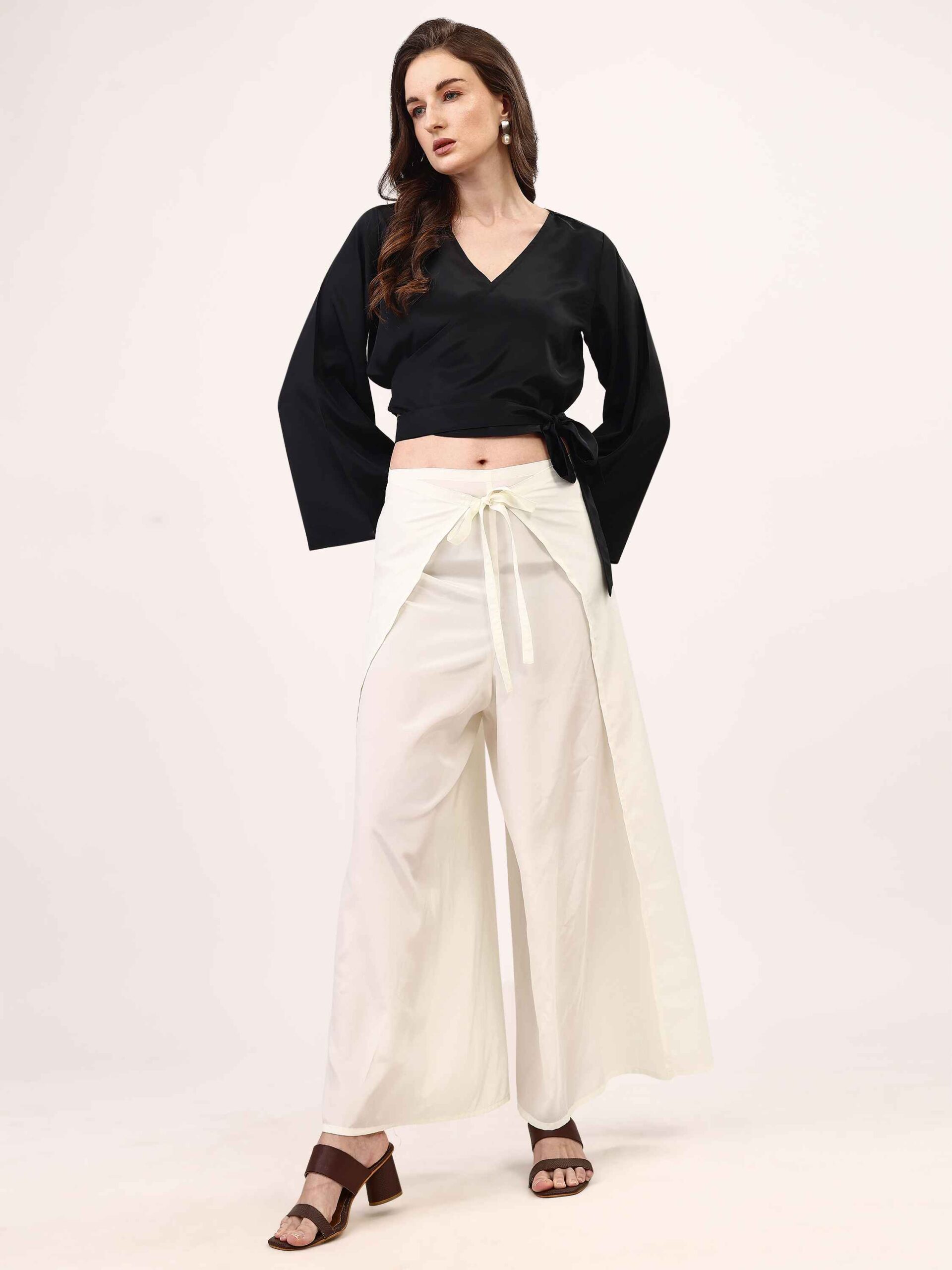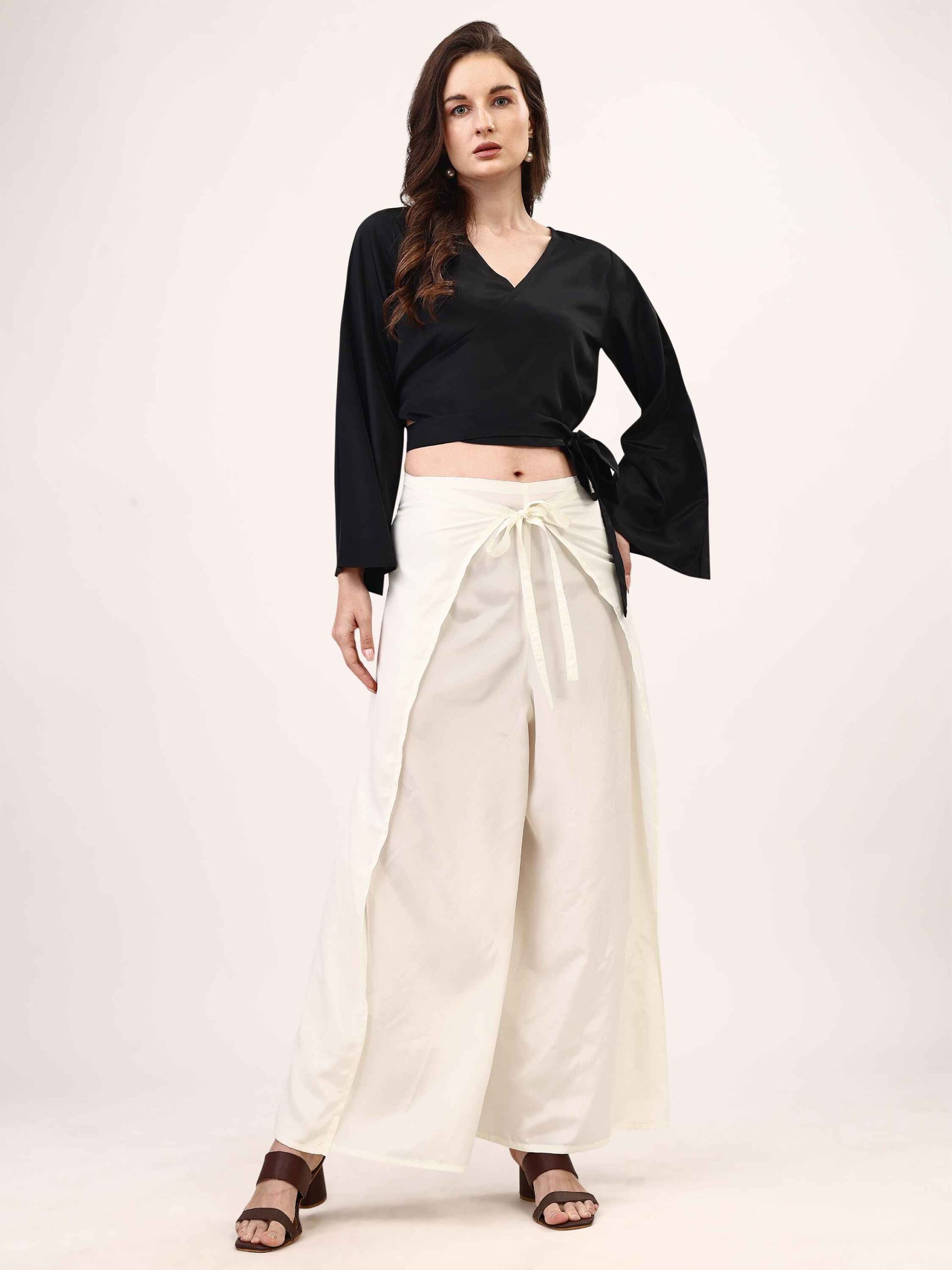 Step out in style with the Off-white Wrap Around Palazzo & Obsidian Top, a chic and comfortable outfit that flatters your shape effortlessly. Made from soft, premium crepe, it feels light, looks elegant, and is perfect for any occasion.