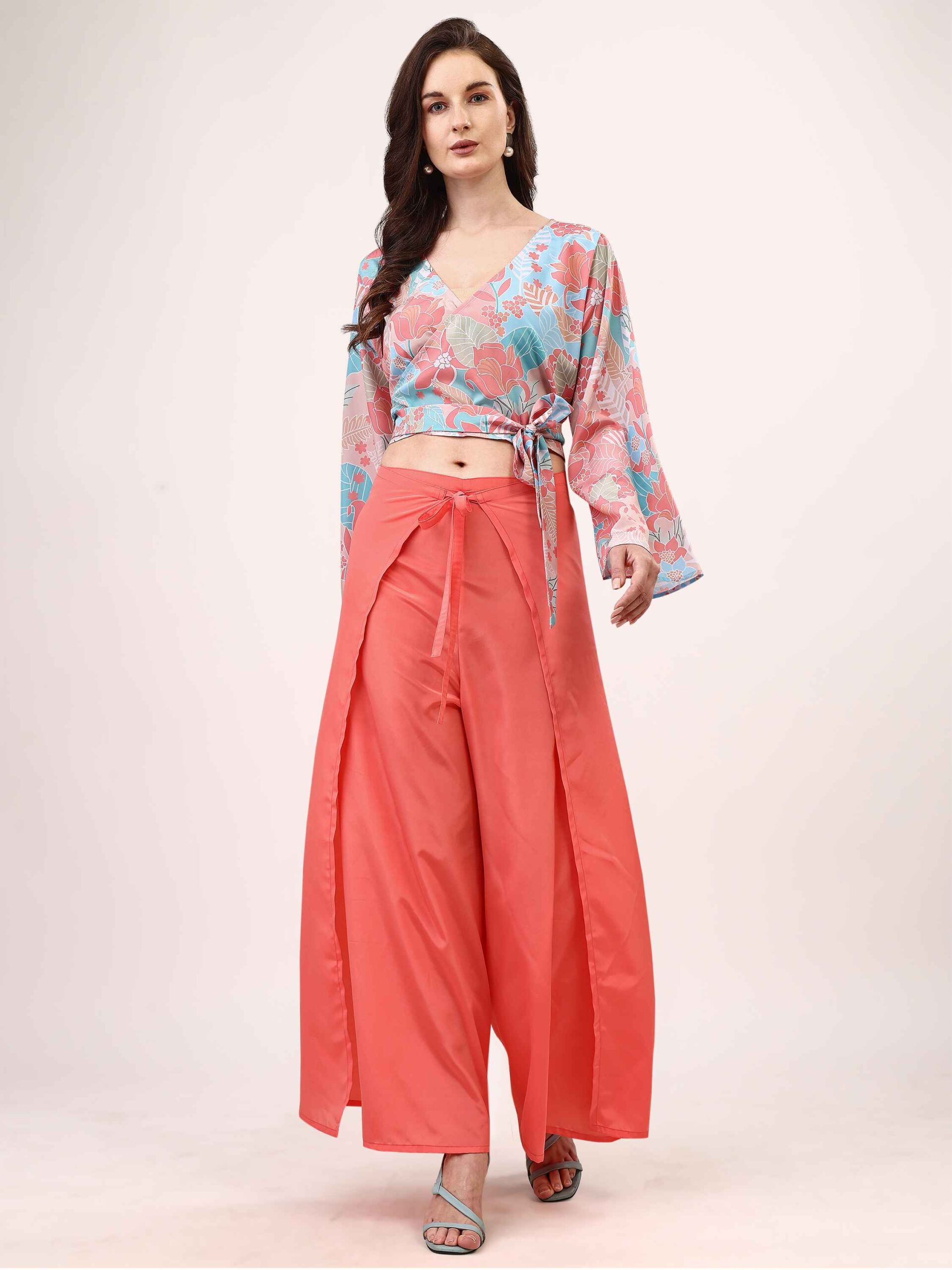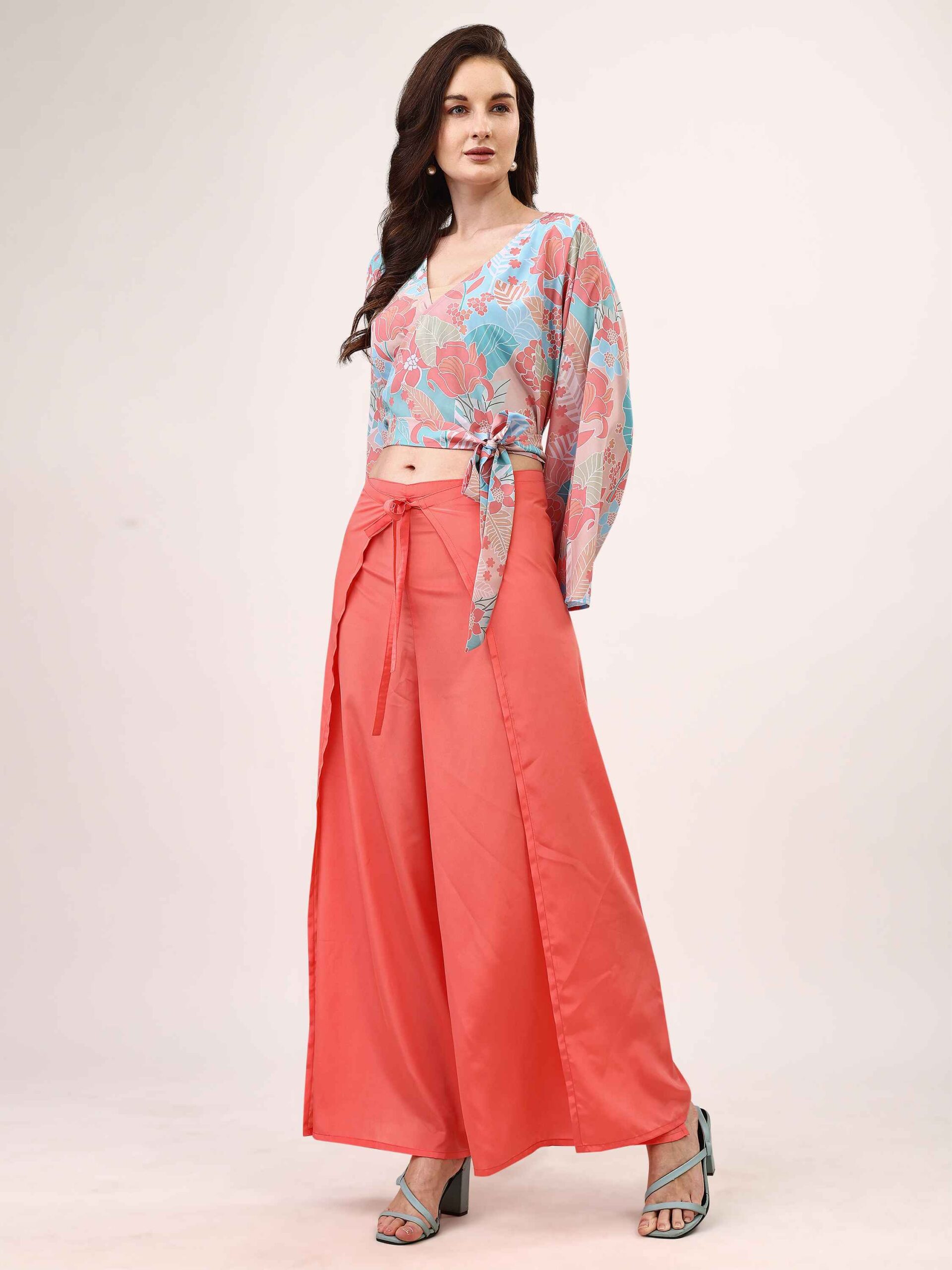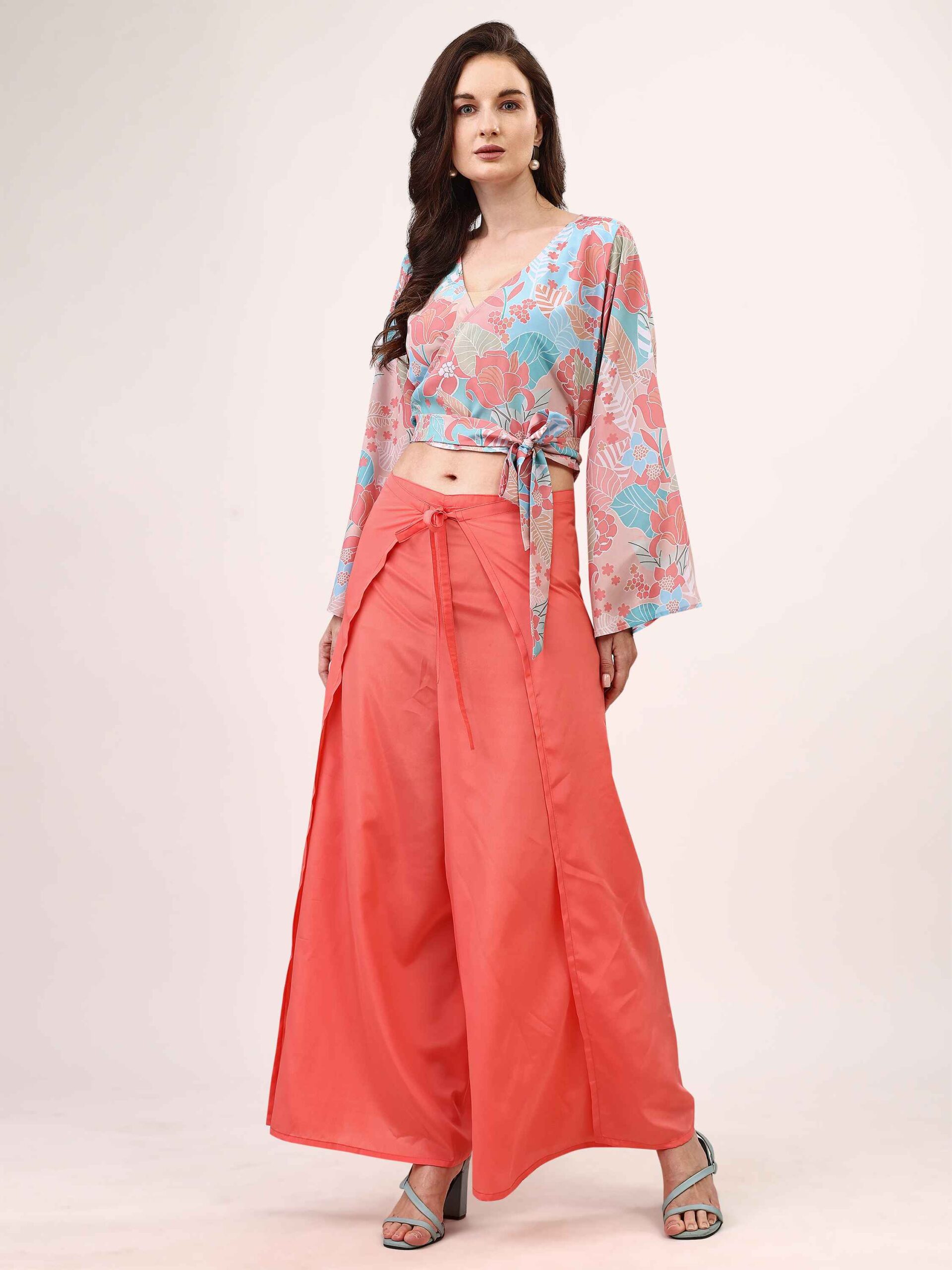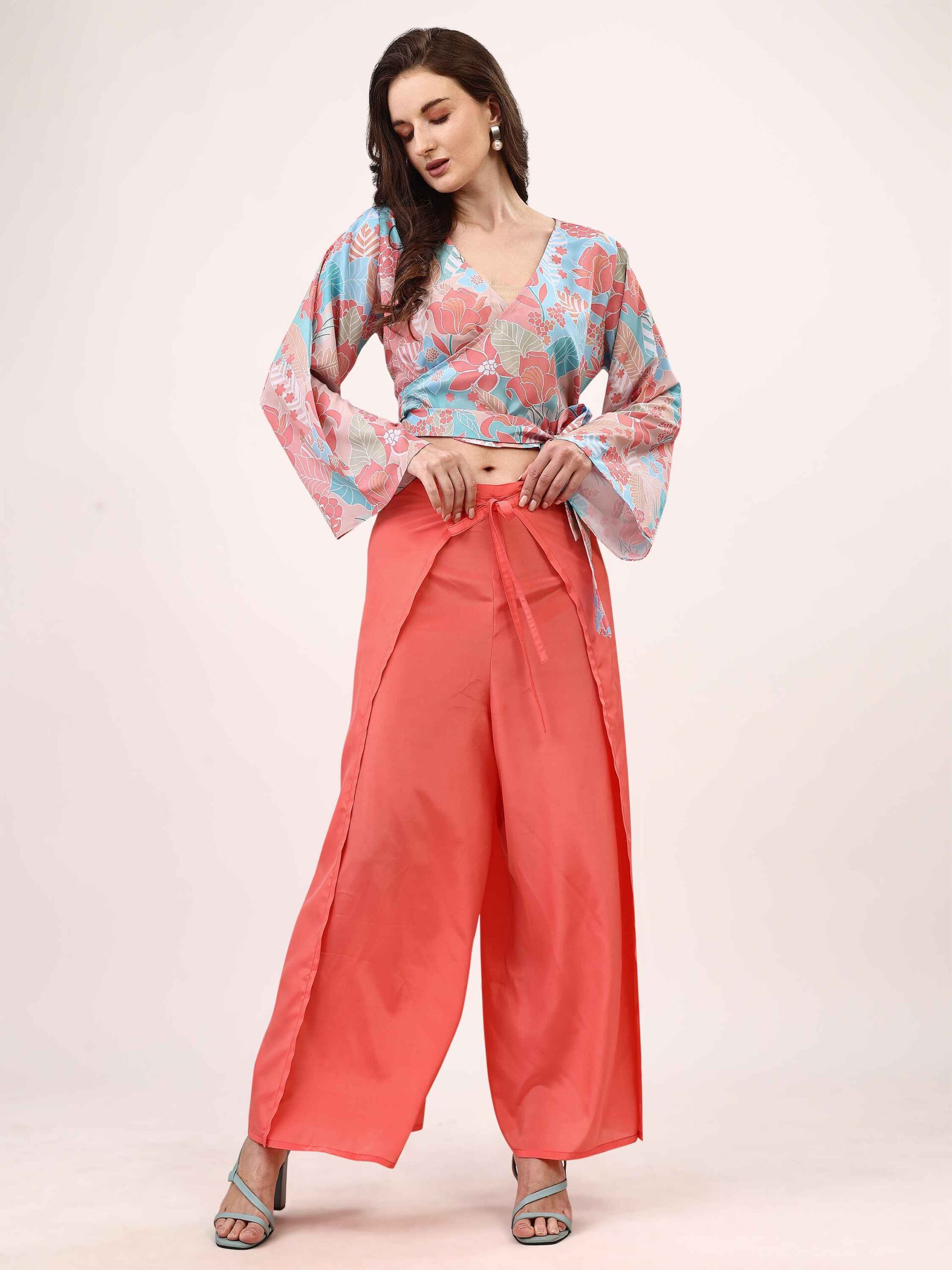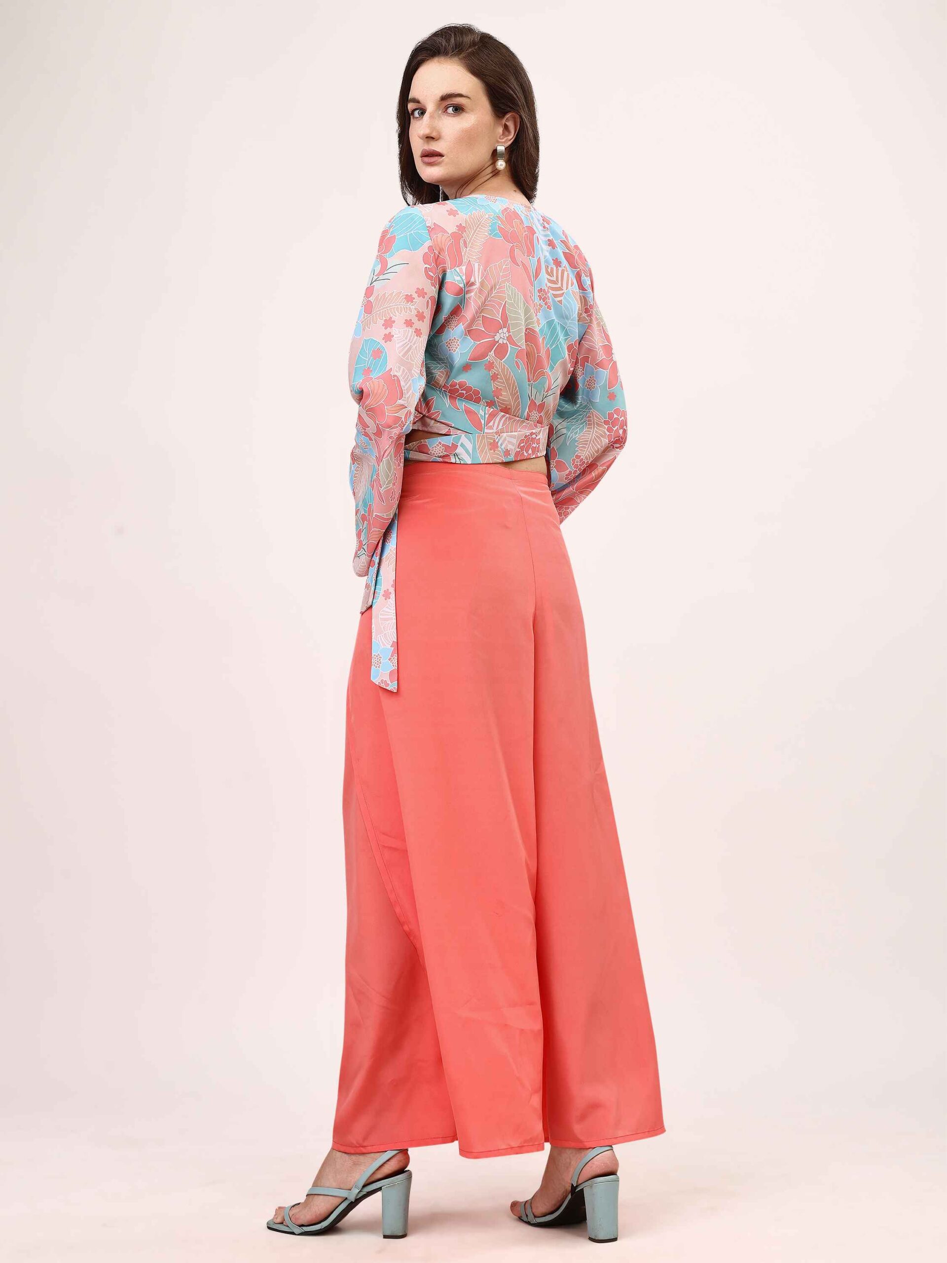 Turn heads with the “Peach Wrap Around Palazzo & Floral Print Top,” a stunning blend of style and sophistication. Designed with a flattering wrap silhouette, this palazzo offers effortless elegance that enhances your figure. Expertly crafted from premium crepe, it boasts a gentle sheen, a soft touch, and unparalleled comfort. Step into its captivating allure and leave an unforgettable impression.
