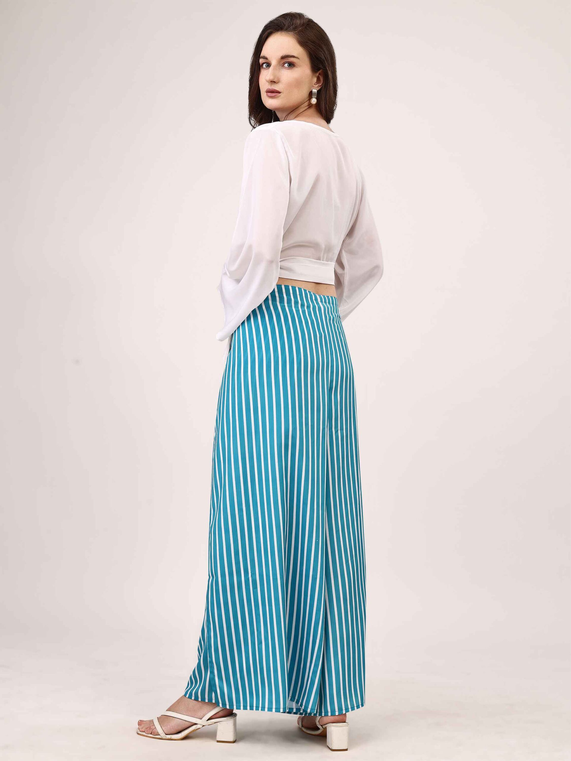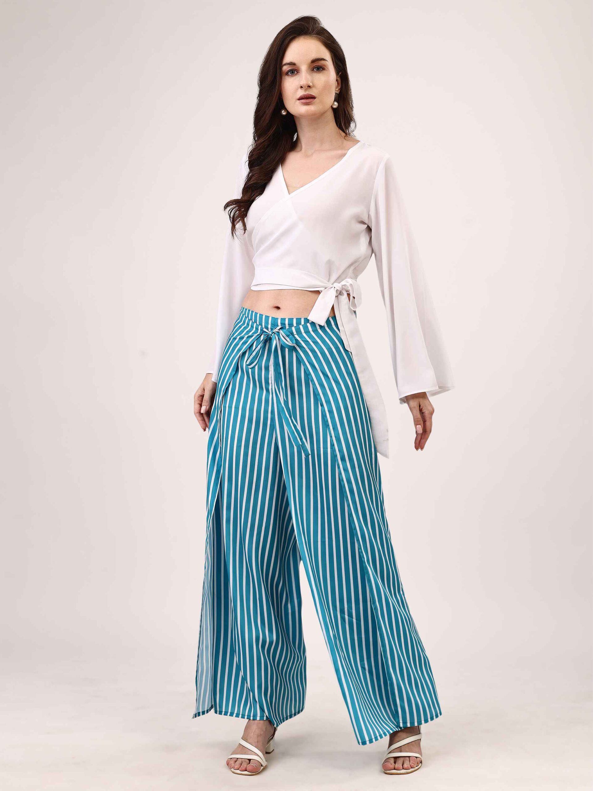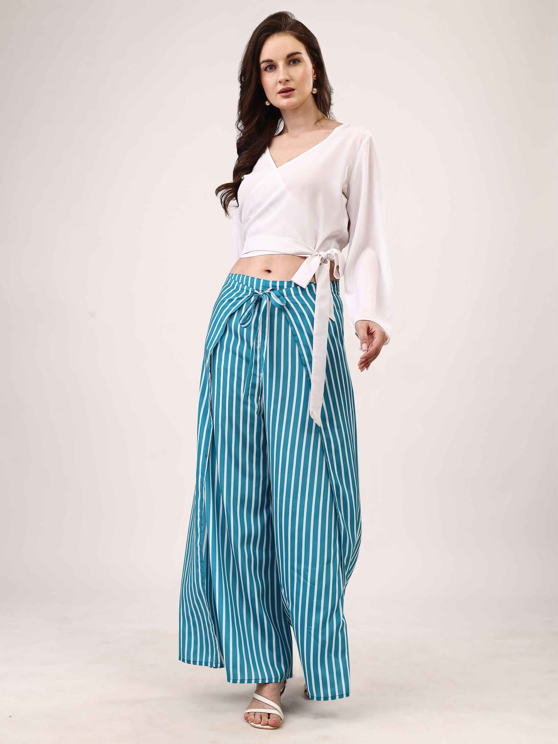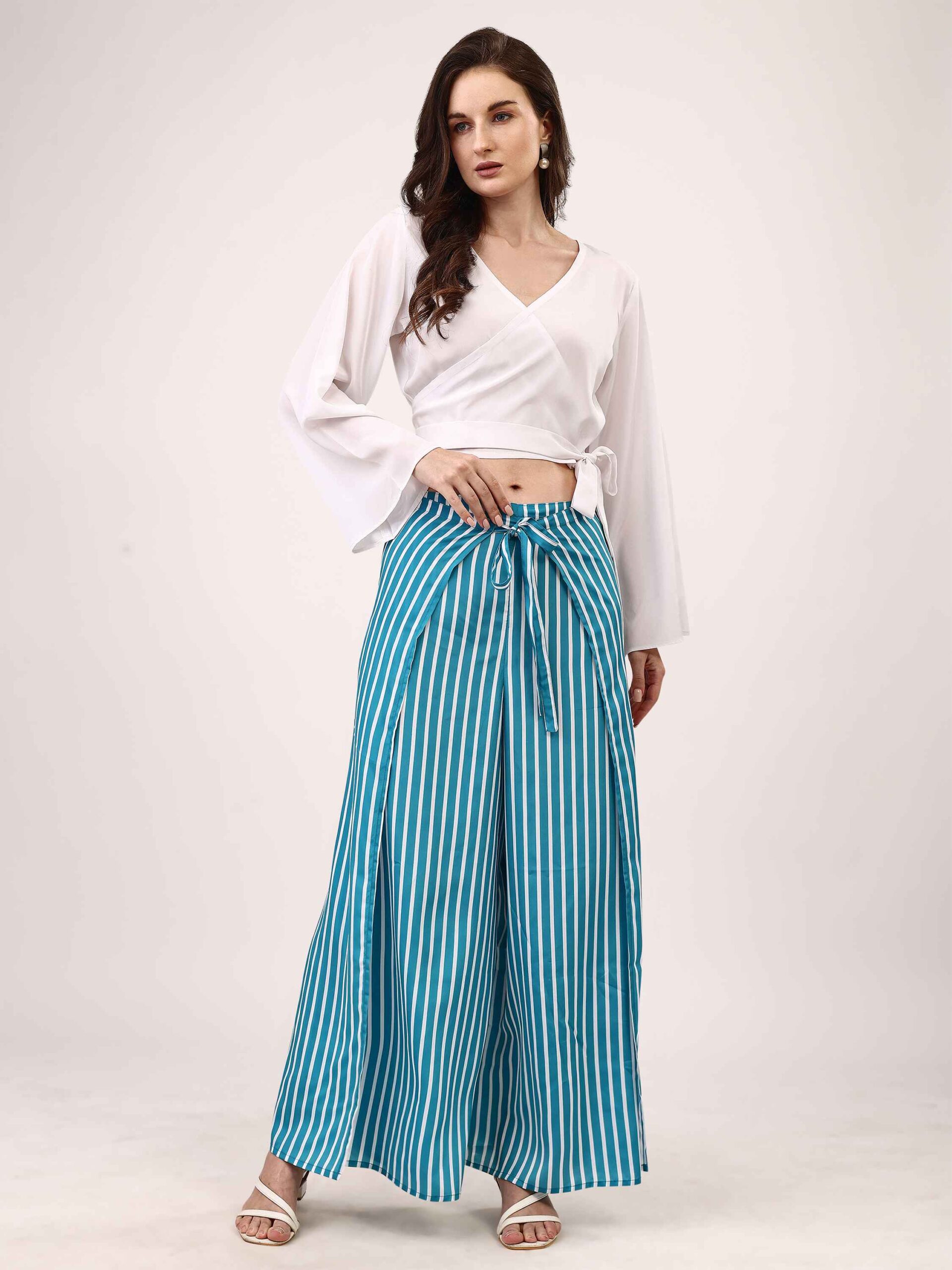 • This white top and wrap-around blue palazzo set exudes sophistication with a refined, flowing silhouette.